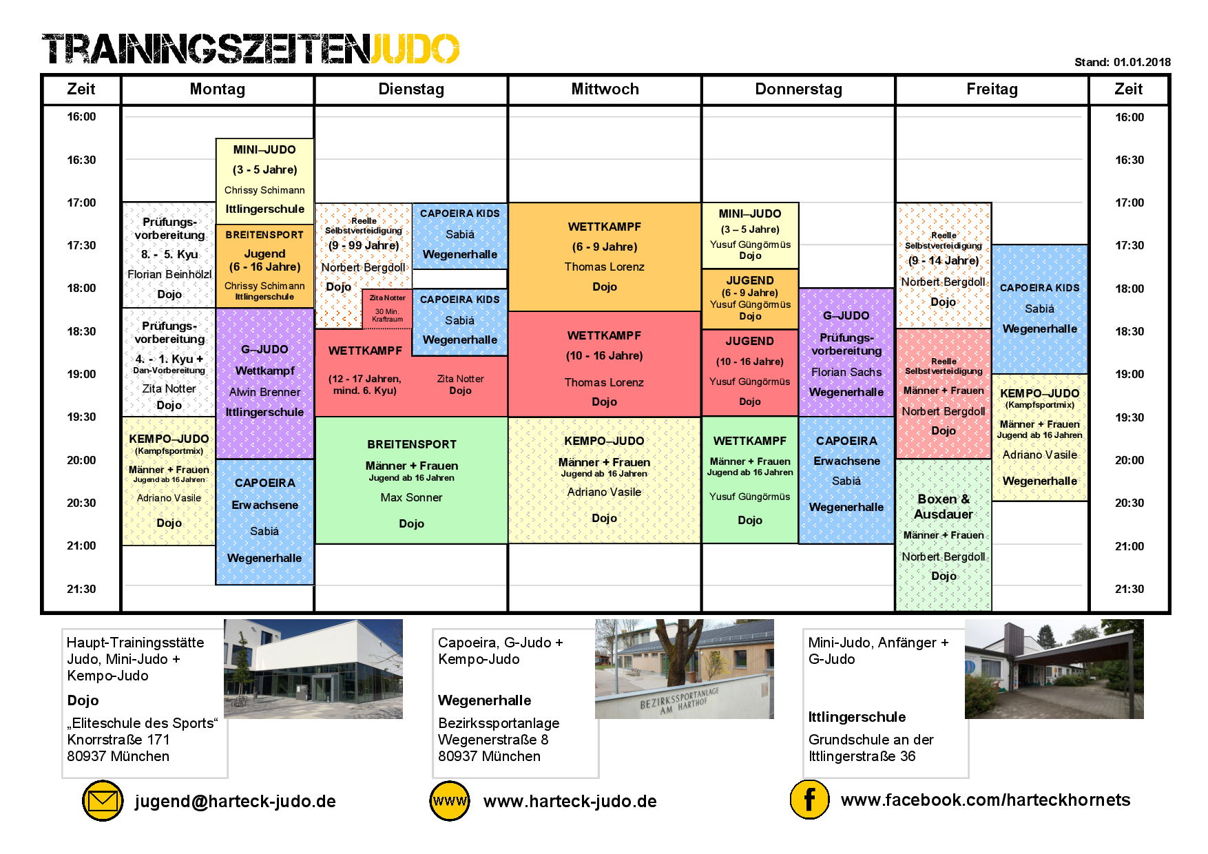 Deswegen hier die Trainingszeiten der Harteck Hornets 2018 für Judo, Selbstverteidigung und Capoeira!